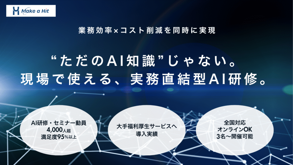 チャットボット導入を検討されている企業様は、まず社員のAI活用スキル向上から始めることをおすすめします。メイカヒットのAI研修では、実務に直結するAI活用方法を体系的に学習できるプログラムを提供しており、チャットボット導入の成功確率を大幅に向上させられます。