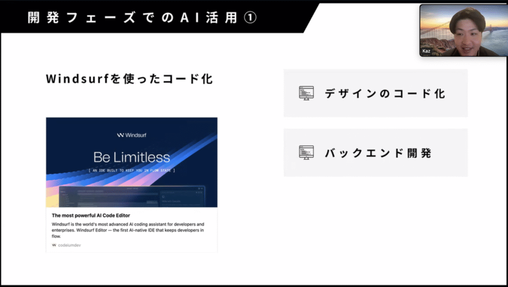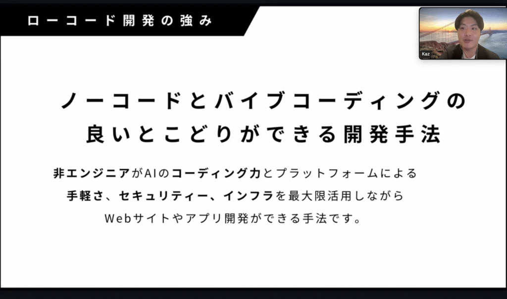 今回は、Kazさんにゲストでご登壇いただき、AI×ローコード開発のノウハウを実際の画面を見せていただきなから解説していただきました。これまでは、エンジニアがいないと不可能だったこともAIの進化により可能になっていることを改めて実感できる内容で、参加者からも好評の声をたくさんいただきました。